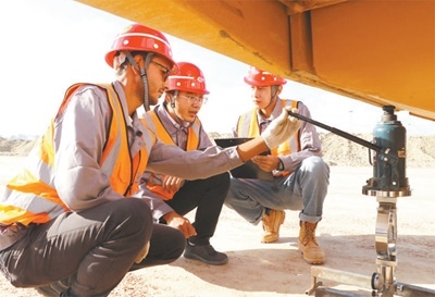 在阿布基爾集裝箱碼頭項(xiàng)目,中方員工向埃方新入職員工(左)講授級配碎石檢測知識。史筱迪攝