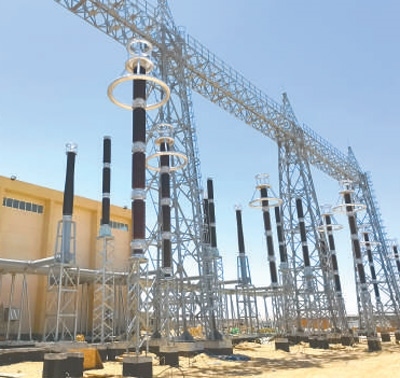 位于蘇伊士省的??怂_迪亞500千伏變電站項(xiàng)目現(xiàn)場,鐵塔高聳,一條條高壓輸電導(dǎo)線接入變電站設(shè)備,電流通過導(dǎo)線時發(fā)出嗡嗡聲。