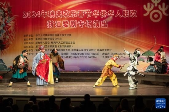 2月2日,瑞典斯德哥爾摩中國文化中心在斯德哥爾摩舉辦活動(dòng),通過美食、年畫、彩燈、舞龍和婺劇等多種形式,讓當(dāng)?shù)孛癖姾腿A僑華人享受了一場(chǎng)“歡樂春節(jié)”的文化大餐。這是演員在活動(dòng)中表演婺劇。新華社發(fā)(魏學(xué)超攝)
