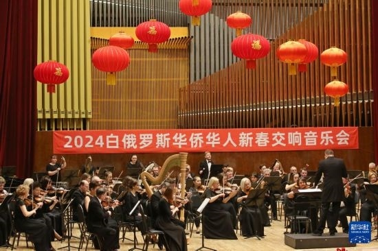 2月2日晚,2024“溫暖迎春·共慶中國年”白俄羅斯華僑華人新春交響音樂會(huì)在白俄羅斯明斯克的白俄羅斯國家音樂廳舉辦。這是來自白俄羅斯的音樂家在音樂會(huì)上演奏。新華社發(fā)(任科夫攝)