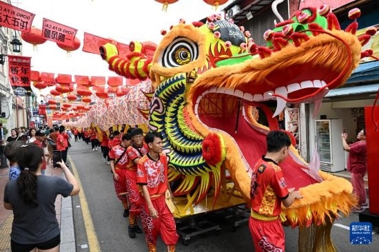 臨近春節(jié),馬來西亞馬六甲市雞場(chǎng)街上大紅燈籠高懸,一派喜慶景象。2月1日,由馬來西亞和中國的100多名青少年組成的舞龍隊(duì),共舞一條近200米的“長(zhǎng)龍”在街道上穿行而過,蔚為壯觀,引人注目。
