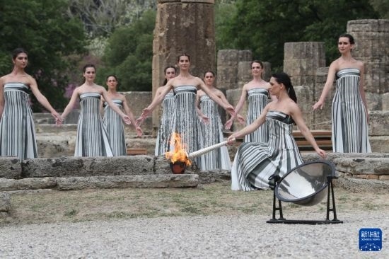 4月16日,扮演最高女祭司的演員瑪麗·米娜取得圣火。新華社記者 李京 攝