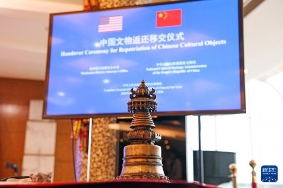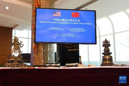 4月17日,在美國(guó)紐約中國(guó)駐紐約總領(lǐng)館,中美雙方代表出席中國(guó)流失文物藝術(shù)品返還移交儀式。新華社記者 李睿 攝