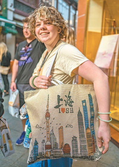 在上海豫園商城內(nèi),馬斯卡廷中學(xué)學(xué)生展示選購(gòu)的商品。王 初攝(人民視覺)