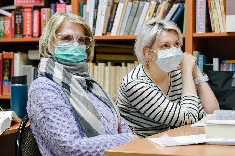 2021年3月4日,學(xué)生在位于莫斯科的俄羅斯國立人文大學(xué)孔子學(xué)院課堂上學(xué)習(xí)漢語。新華社發(fā)(葉甫蓋尼·西尼岑攝)