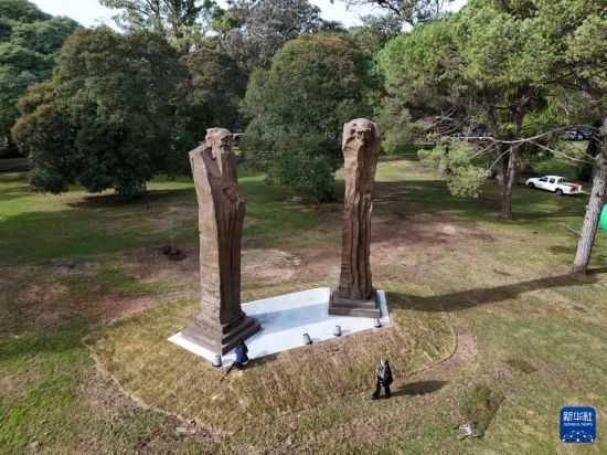 這是5月29日在烏拉圭首都蒙得維的亞市中心的巴特列公園拍攝的雕塑作品《問(wèn)道》(無(wú)人機(jī)照片)。新華社發(fā)(尼古拉斯·塞拉亞攝)