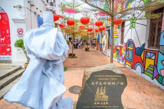 這是2019年12月20日在馬來西亞馬六甲拍攝的鄭和·朵云軒(馬六甲)藝術(shù)館外的馬中友好植樹廣場。600多年前,鄭和五次駐節(jié)馬六甲,由他帶到這片土地上的中華文化如今已深深融入當?shù)囟嘣幕?。新華社記者朱煒攝