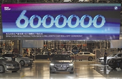 遼寧沈陽(yáng)市的華晨寶馬汽車有限公司大東工廠,在華晨寶馬第600萬(wàn)輛整車下線儀式現(xiàn)場(chǎng),電子大屏幕上“6000000”字樣不停閃爍。新華社記者 潘昱龍攝