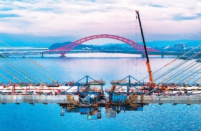 近日,浙江寧波舟山港六橫公路大橋一期項目梅山水道橋即將合龍。該大橋建成后,可實現(xiàn)六橫島、佛渡島、梅山島三島港區(qū)、產(chǎn)業(yè)聯(lián)動發(fā)展,推動甬舟一體化駛?cè)搿翱旌降馈?。胡學軍攝(人民視覺)