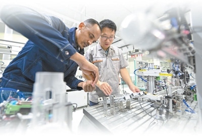 天津職業(yè)技術師范大學埃塞俄比亞博士留學生涂則鋼(左)在老師的指導下調(diào)試儀器。新華社記者 孫凡越攝