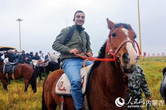 馬贊·伊斯蘭姆在呼和浩特市敕勒川草原感受騎馬。人民網(wǎng)記者 張雪冬攝