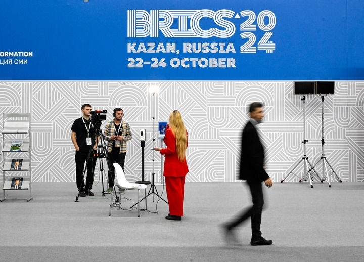 2024年10月23日,媒體工作人員在俄羅斯喀山金磚峰會新聞中心工作。新華社記者 申宏 攝