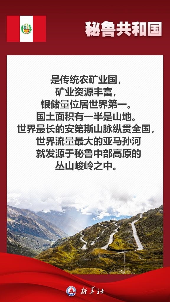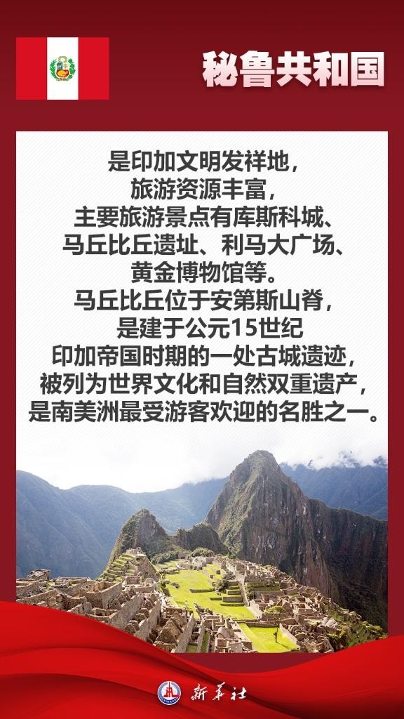 應(yīng)秘魯共和國總統(tǒng)博魯阿爾特邀請(qǐng),國家主席習(xí)近平將于11月13日至17日赴利馬出席亞太經(jīng)合組織第三十一次領(lǐng)導(dǎo)人非正式會(huì)議并對(duì)秘魯進(jìn)行國事訪問。秘魯位于南美洲西部,是印加文明發(fā)祥地,也是最早同新中國建交的拉美國家之一。關(guān)于秘魯,七張海報(bào)帶你了解更多——