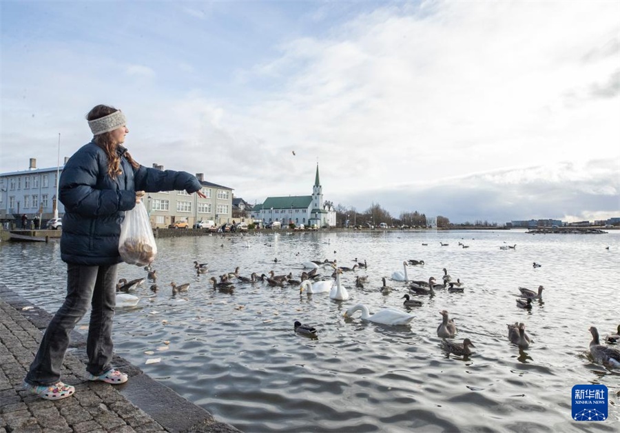3月15日,在冰島首都雷克雅未克,一名女孩在特約寧湖投喂天鵝。