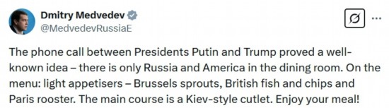 俄羅斯總統(tǒng)普京同特朗普18日通電話。俄聯(lián)邦安全會(huì)議副主席梅德韋杰夫就此表態(tài)稱(chēng),這表明餐廳里只有俄美,歐洲和烏克蘭都在菜單上,歐洲是開(kāi)胃小菜,而主菜是烏克蘭。