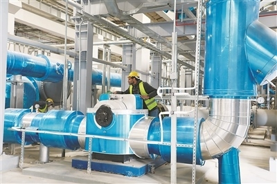 埃及新行政首都中央商務區(qū)項目能源中心設置的變頻空調(diào)水泵,為空調(diào)系統(tǒng)循環(huán)提供動力,通過變頻調(diào)節(jié)實現(xiàn)節(jié)省電能的目的。圖為工作人員對水泵進行檢查和維護。