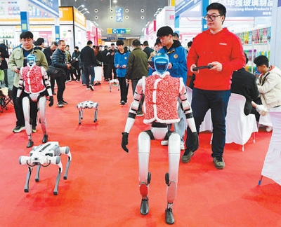 2025年3月14日,在2025中國(guó)義烏國(guó)際日用百貨創(chuàng)新博覽會(huì)上,智能機(jī)器人與現(xiàn)場(chǎng)人員互動(dòng)。