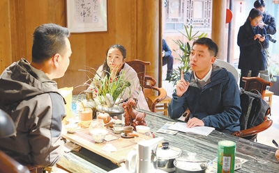 出生在緬甸的余鴻仙(右一)向客人介紹翡翠。
