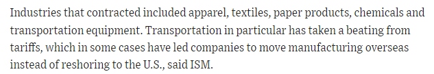 文章指出,美國制造業(yè)活動萎縮的行業(yè)主要包括服裝、紡織品、紙制品、化工產(chǎn)品和運(yùn)輸業(yè)。文章表示,雖然當(dāng)前美國工廠產(chǎn)量有所增加,但未售出的庫存卻急劇增加。需求增長放緩,這在出口市場體現(xiàn)尤為明顯,而受關(guān)稅影響,出口市場的前景更加暗淡。