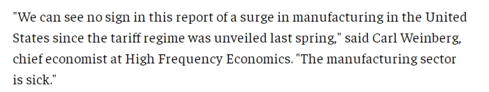 文章指出,美國政府曾辯稱,加征關(guān)稅是保護(hù)美國國內(nèi)制造業(yè)的必要之舉,但經(jīng)濟(jì)學(xué)家則認(rèn)為,由于包括勞動力短缺在內(nèi)的結(jié)構(gòu)性問題,美國制造業(yè)已無法恢復(fù)昔日輝煌。文章援引高頻經(jīng)濟(jì)咨詢公司首席經(jīng)濟(jì)學(xué)家卡爾·溫伯格(Carl Weinberg)的話表示,“從(ISM)這份報(bào)告中,我沒有看到自關(guān)稅政策出臺以來,美國制造業(yè)出現(xiàn)任何增長的跡象,美國制造業(yè)已經(jīng)病了?!?/p>