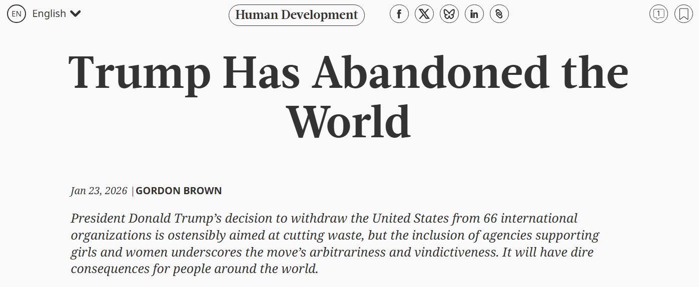 布朗在文章中指出,美國宣布退出的66個國際組織中包括31個聯(lián)合國下屬機構(gòu)和35個非聯(lián)合國機構(gòu)。他批評說,從未有任何一國領(lǐng)導(dǎo)人,能在短短一個月內(nèi)如此全面地切斷本國與國際社會的聯(lián)系。