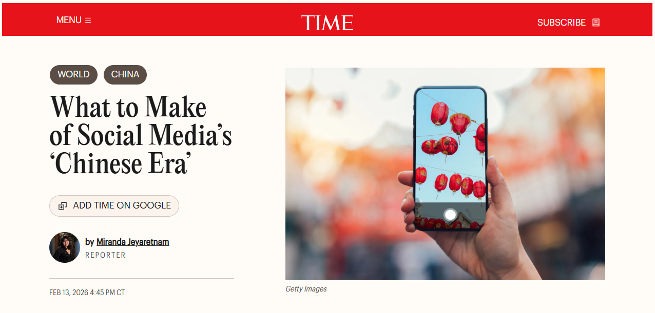 美國(guó)《時(shí)代》周刊網(wǎng)站2月13日的一篇文章稱,伴隨著今年的中國(guó)新年,社交網(wǎng)絡(luò)上介紹中國(guó)文化的內(nèi)容不少。這是一種新的趨勢(shì),美國(guó)社交媒體用戶視自己為“中國(guó)人”,擁抱“Chinese era”(中國(guó)時(shí)代)或者“Chinamaxxing”(極致中國(guó)化)。觀察家分析,這一趨勢(shì)反映了隨著中國(guó)的開放和軟實(shí)力的提升,人們對(duì)中國(guó)越來(lái)越著迷。