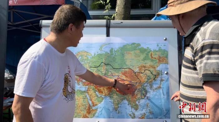 2023年6月11日,德國(guó)民眾沃爾夫?qū)たɡ┛嗽诘聡?guó)杜伊斯堡趣味龍舟賽上了解中歐班列線路圖。中新社記者 馬秀秀 攝