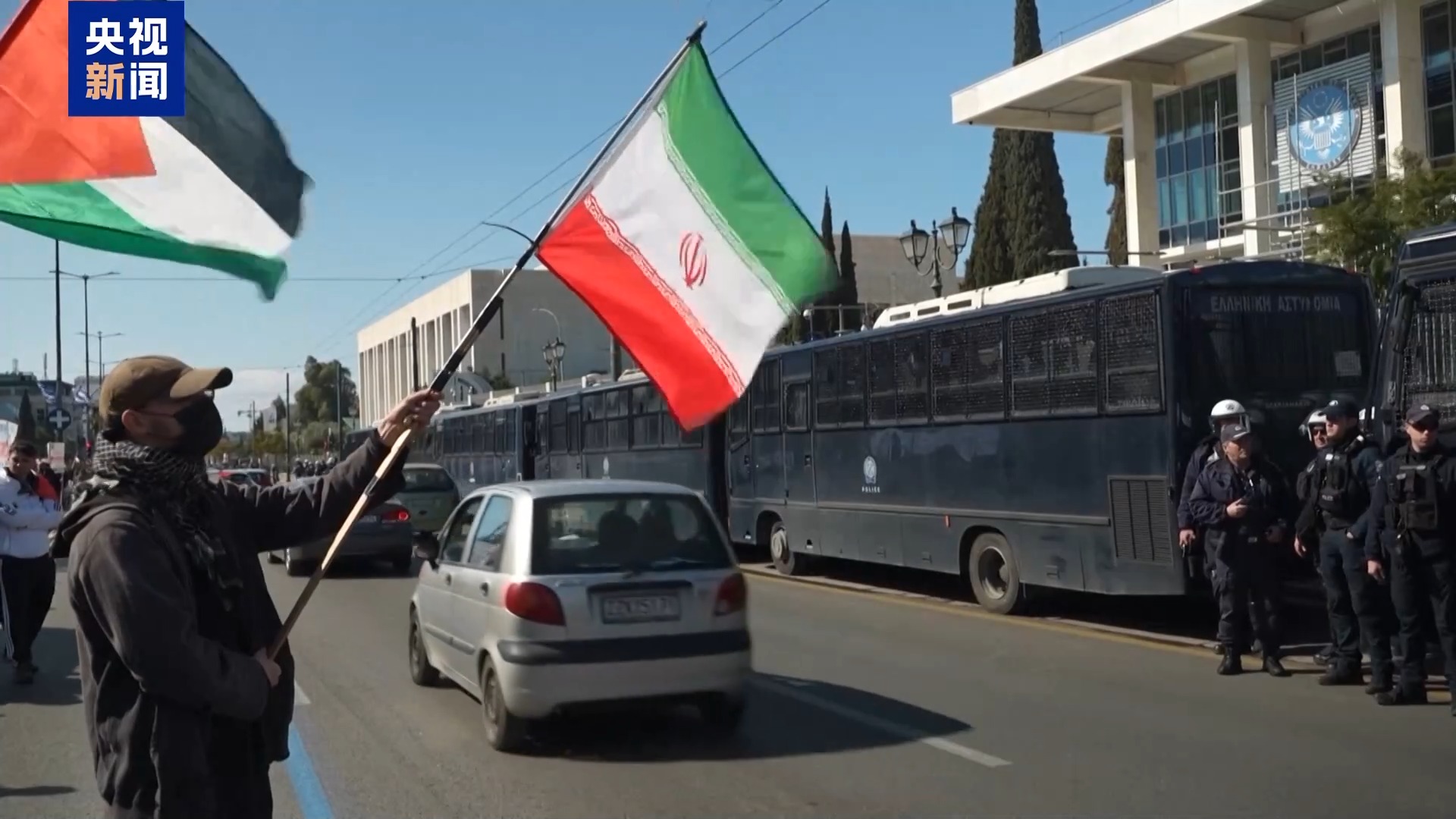 在希臘雅典的美國和以色列大使館前,逾千名示威者手持伊朗國旗或標(biāo)語牌、高喊口號參與游行示威活動(dòng),抗議美以對伊朗發(fā)動(dòng)襲擊。為維護(hù)現(xiàn)場秩序,當(dāng)?shù)爻鰟?dòng)大量警力并在美國和以色列大使館前使用一排警用大巴封鎖隔離。