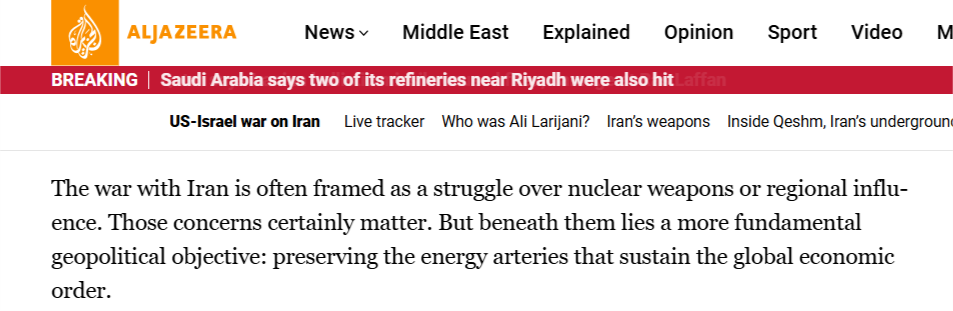 半島電視臺的報道稱,最近的事態(tài)發(fā)展表明,另一種更深層次、美國政府由來已久的“石油邏輯”正在發(fā)揮作用。美國的根本目的是控制資源,保障石油的流動性,這是全球資本主義經(jīng)濟(jì)的命脈。