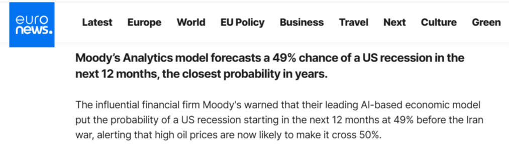 美政府接連出手的背后是疲軟的經(jīng)濟(jì)與通脹的預(yù)期無法承受高油價。而放任針對能源基礎(chǔ)設(shè)施的襲擊將進(jìn)一步威脅全球能源供應(yīng),推高油價。目前美國汽油價格已飆升至自2023年以來的最高水平,而據(jù)歐洲新聞臺3月18日報道,穆迪分析(Moody's Analytics)模型預(yù)測,未來12個月內(nèi)美國經(jīng)濟(jì)陷入衰退的概率為49%,這是多年來最接近臨界點(diǎn)的一次。該模型還提醒稱,當(dāng)前高企的油價很可能使這一概率突破50%。