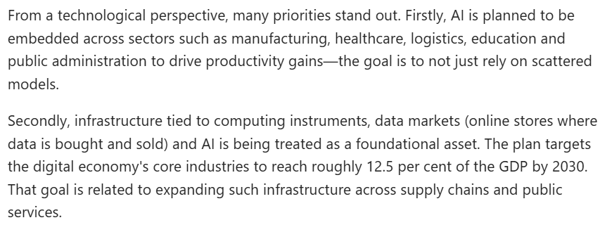 文章認為,首先,人工智能被規(guī)劃融入制造業(yè)、醫(yī)療、物流、教育及公共管理等領(lǐng)域,以提升生產(chǎn)力,其目標是不再局限于零散的應(yīng)用模式。其次,與計算設(shè)備、數(shù)據(jù)市場及人工智能相關(guān)的基礎(chǔ)設(shè)施,正被視作一種基礎(chǔ)性資產(chǎn)。規(guī)劃綱要提出,“十五五”時期數(shù)字經(jīng)濟核心產(chǎn)業(yè)增加值占國內(nèi)生產(chǎn)總值比重達到12.5%。這一目標與在供應(yīng)鏈及公共服務(wù)領(lǐng)域擴展此類基礎(chǔ)設(shè)施密切相關(guān)。