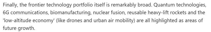 文章還注意到,當前,中國繼續(xù)要求在科學(xué)技術(shù)等多個領(lǐng)域取得突破。這意味著,中國需要在整個技術(shù)體系層面構(gòu)建抗壓能力,而非依賴個別領(lǐng)域的孤立進展。此外,規(guī)劃綱要所涵蓋的前沿技術(shù)領(lǐng)域極為廣泛。量子技術(shù)、第六代移動通信技術(shù)、生物制造、核聚變、可復(fù)用重型運載火箭以及“低空經(jīng)濟”(包括無人機與城市空中交通)等,均被明確為未來發(fā)展的重點方向。