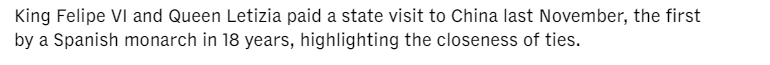 西班牙首相桑切斯4月11日至15日對中國進行正式訪問。此訪是桑切斯四年內(nèi)第四次訪華。多家外媒都予以關(guān)注和報道。亞洲新聞臺的報道說,去年11月,西班牙國王費利佩六世對中國進行了國事訪問,這是西班牙國王時隔18年再次訪華,凸顯了兩國關(guān)系的密切性。