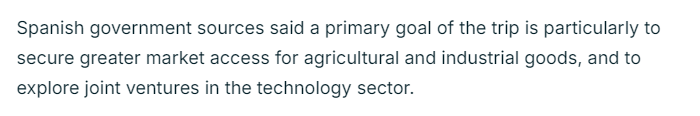 法國24新聞臺的報道認為,桑切斯希望通過此訪將西班牙定位為中國與歐盟27個成員國之間的重要橋梁。報道援引西班牙政府消息人士的話稱,此訪的主要目標是擴大經(jīng)貿(mào)合作,尤其是在農(nóng)產(chǎn)品、工業(yè)品方面,并探索雙方在技術(shù)領(lǐng)域的合作。同時,西班牙還將利用此次訪問為歐元區(qū)第四大經(jīng)濟體吸引新的投資。