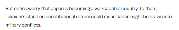 文章認為,日本首相高市早苗一直支持修改和平憲法。雖然她尚未明確說明具體修改內容,但許多人認為這將涉及修改放棄戰(zhàn)爭的憲法第九條。批評人士擔心日本正朝著成為一個具備戰(zhàn)爭能力的國家邁進。高市早苗在憲法改革問題上的立場可能意味著日本將介入軍事沖突。