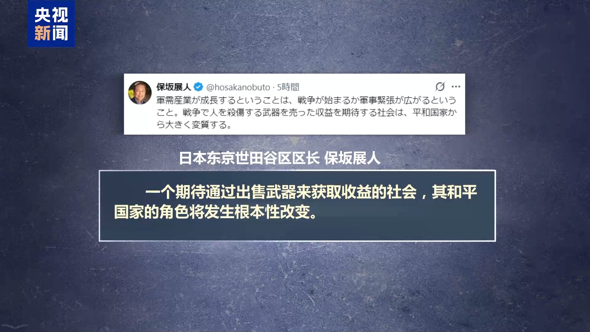 日本東京世田谷區(qū)區(qū)長保坂展人在社交媒體上表示,一個期待通過出售武器來獲取收益的社會,其和平國家的角色將發(fā)生根本性改變。