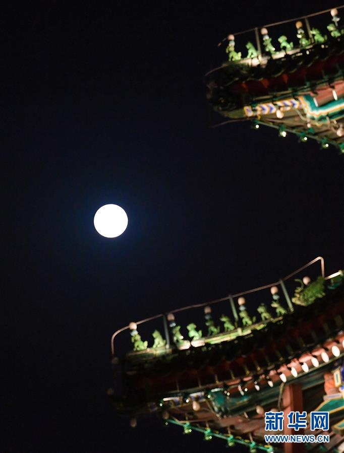 10月1日在北京前門商業(yè)街拍攝的木雕龍頭和月亮。當(dāng)日是農(nóng)歷八月十五,傳統(tǒng)的中秋節(jié)與國(guó)慶節(jié)相遇,共迎圓月。新華社記者李賀攝