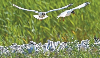 陜西省神木市紅堿淖國家級自然保護(hù)區(qū),遺鷗在島上飛翔。 新華社記者 陶 明攝