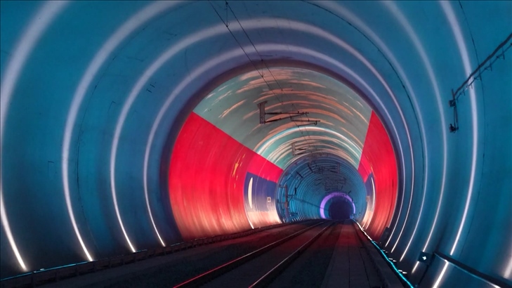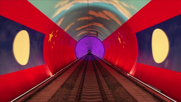 2023年4月9日,云南西雙版納,航拍中老鐵路友誼隧道,隧道內(nèi)各種燈光裝飾,隧道外墻畫展現(xiàn)文化特色。視覺中國(guó)