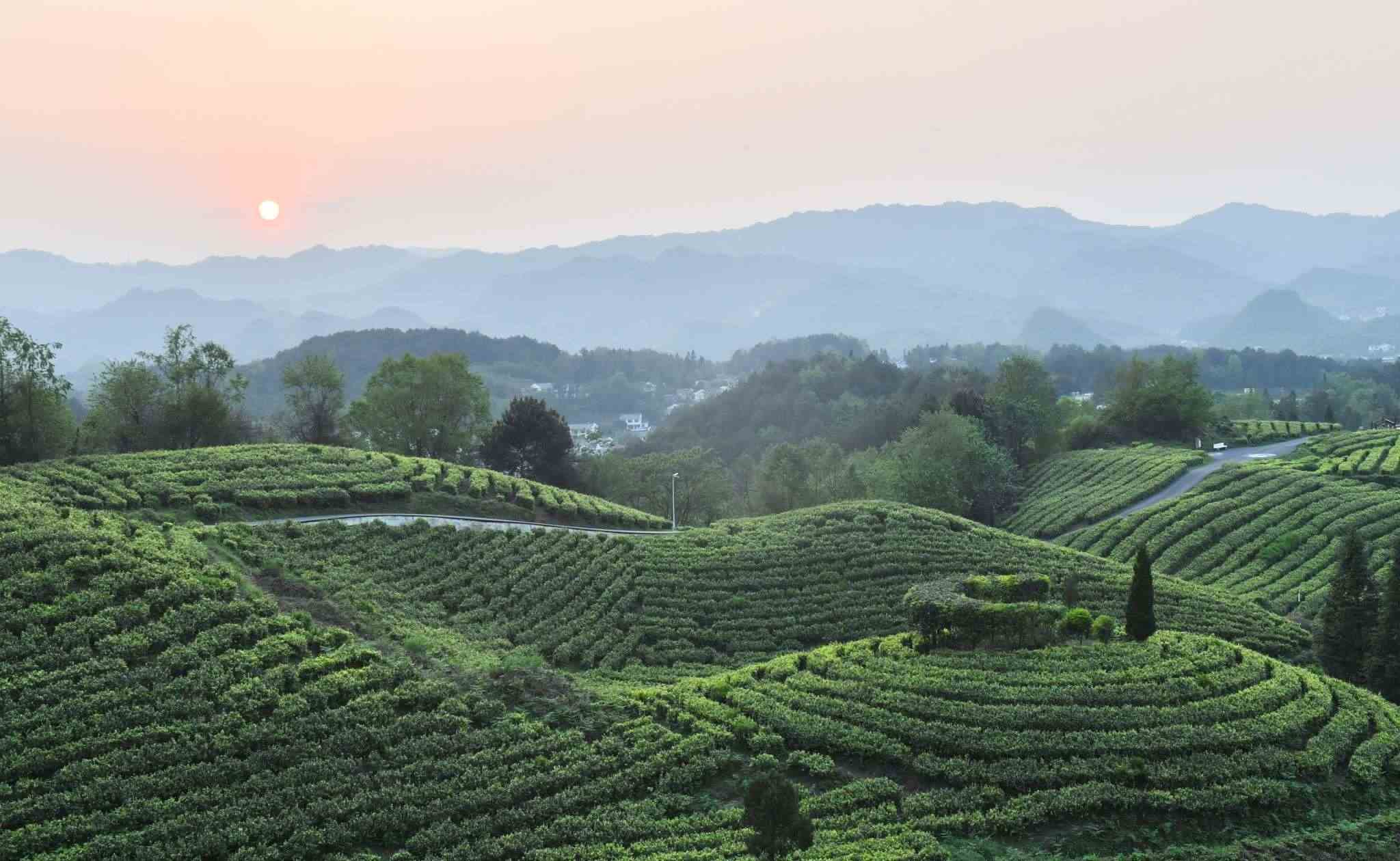 2023年4月14日,貴陽(yáng),觀山湖區(qū)朱昌鎮(zhèn)高寨村神鵲茶場(chǎng),漫山遍野層層疊疊、延綿起伏的茶園綠翠欲滴,茶香四溢,在夕陽(yáng)的照耀下,呈現(xiàn)出一幅幅美麗的畫卷,令人陶醉其間。視覺中國(guó)