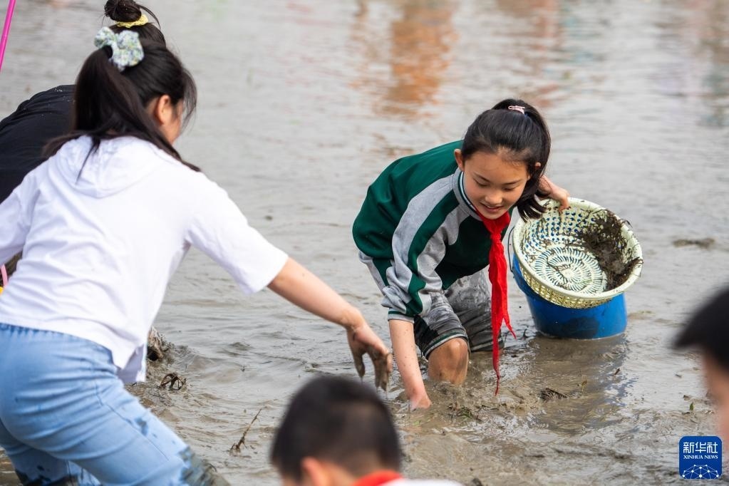 當(dāng)日,在湖南省長沙市寧鄉(xiāng)市灰湯鎮(zhèn)花果山村舉行的農(nóng)耕民俗文化節(jié)學(xué)生研學(xué)活動中,孩子們通過開展稻田插秧、捉泥鰍等“農(nóng)趣” 比賽,走進(jìn)田間地頭,感受勞動帶來的艱辛與快樂。新華社記者 陳思汗 攝