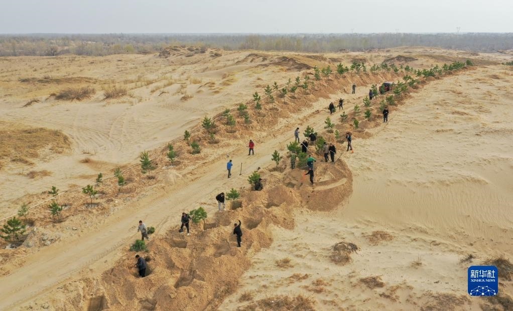 4月15日,在內(nèi)蒙古通遼市科爾沁左翼后旗,治沙工人在科爾沁沙地植樹造林。   新華社記者 連振 攝