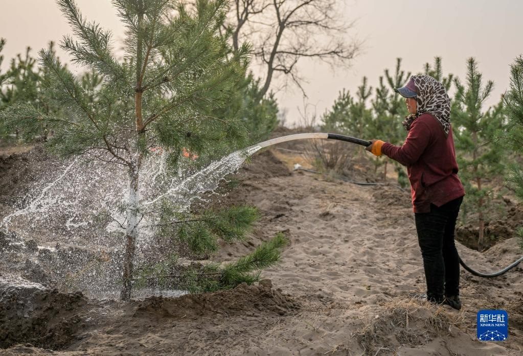 4月15日,在內(nèi)蒙古通遼市科爾沁左翼后旗,治沙工人在科爾沁沙地給樹木澆水。   新華社記者 連振 攝