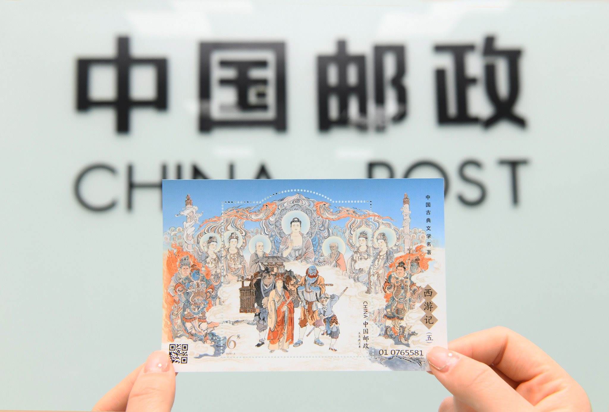 2023年4月27日,中國郵政集團(tuán)公司河北省新樂市分公司,工作人員展示發(fā)行的《中國古典文學(xué)名著—<西游記>(五)》特種郵票。視覺中國