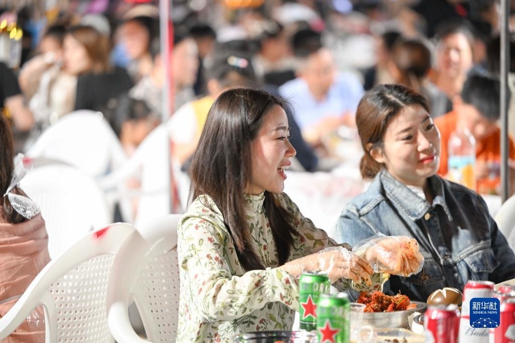 5月2日,游客在江蘇省淮安市金湖縣龍蝦廣場品嘗金湖小龍蝦。