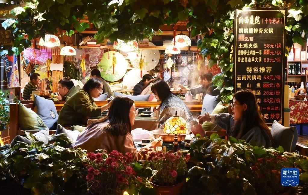 5月2日晚,游人在云南麗江古城享受美食。