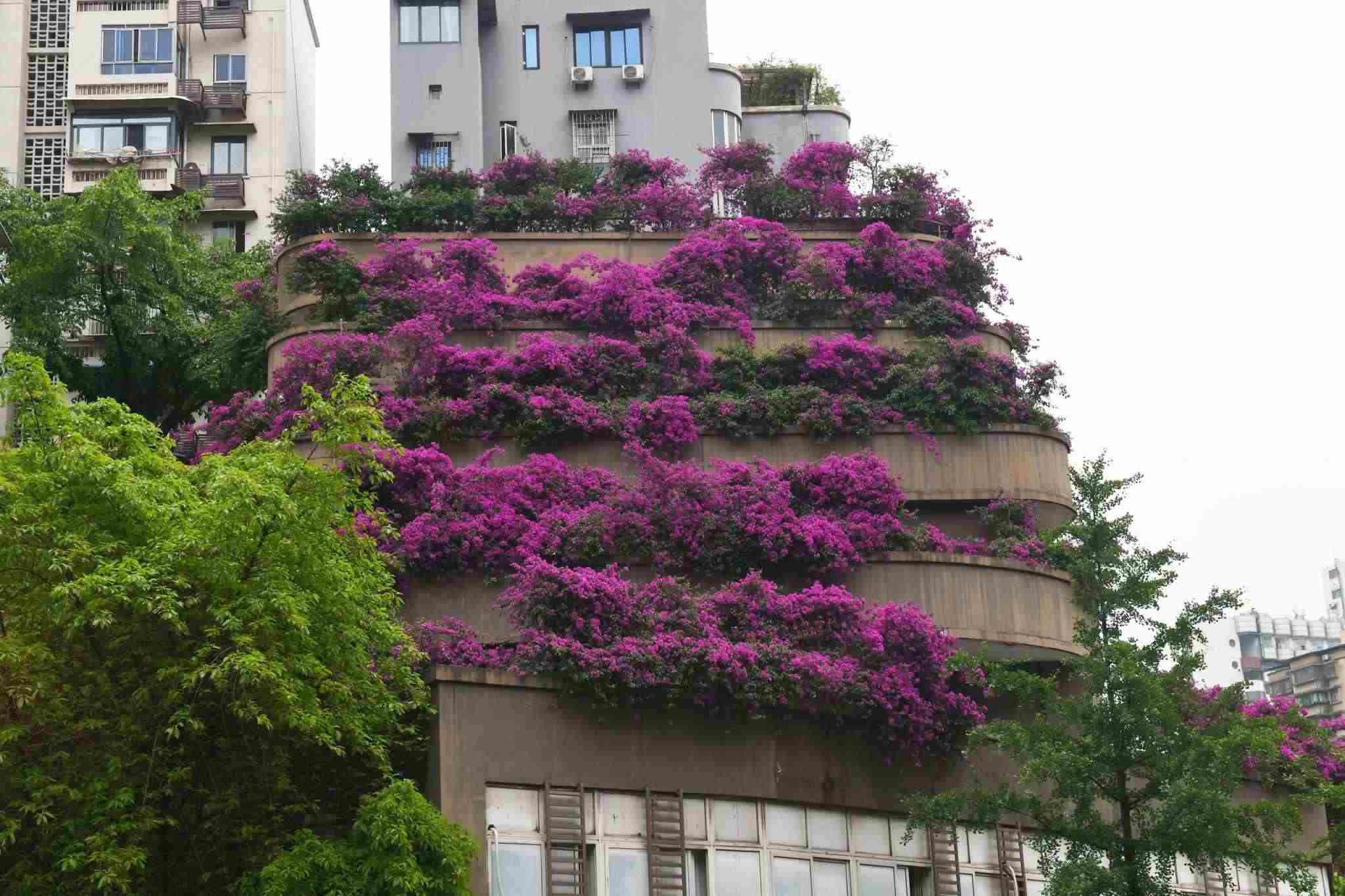 2023年5月5日,重慶,渝中區(qū)上清寺一建筑被盛開的三角梅層層環(huán)繞,仿佛穿上了一件“花衣”。視覺中國(guó)
