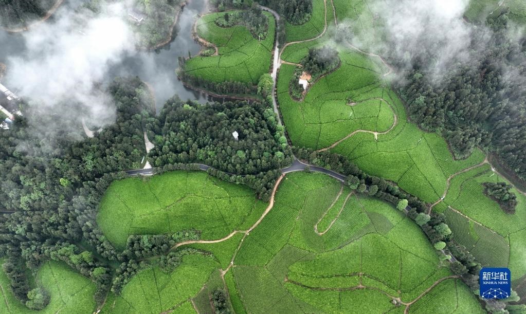 這是5月7日拍攝的鶴峰縣走馬鎮(zhèn)楊柳池茶園(無(wú)人機(jī)照片)。   新華社發(fā)(楊順丕攝)