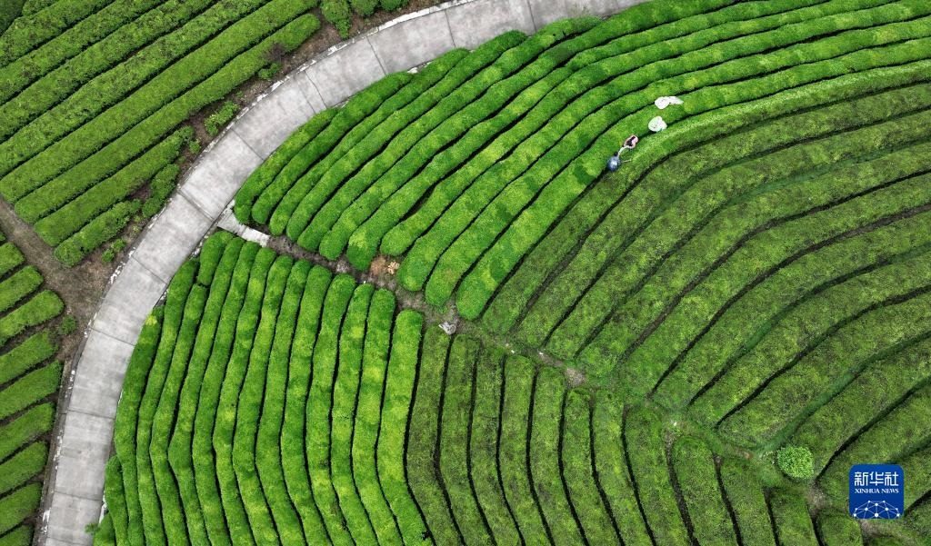 5月7日,茶農(nóng)在鶴峰縣走馬鎮(zhèn)楊柳池茶園采茶(無(wú)人機(jī)照片)。   新華社發(fā)(楊順丕攝)
