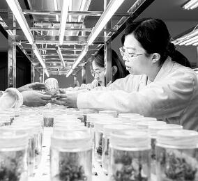 3月29日,在內(nèi)蒙古林業(yè)科學(xué)研究院承擔(dān)的“沙地生物資源保護(hù)與培育國家林業(yè)和草原局重點實驗室”,科研人員在觀察黑果枸杞組培苗的培養(yǎng)狀態(tài)。丁根厚攝/光明圖片